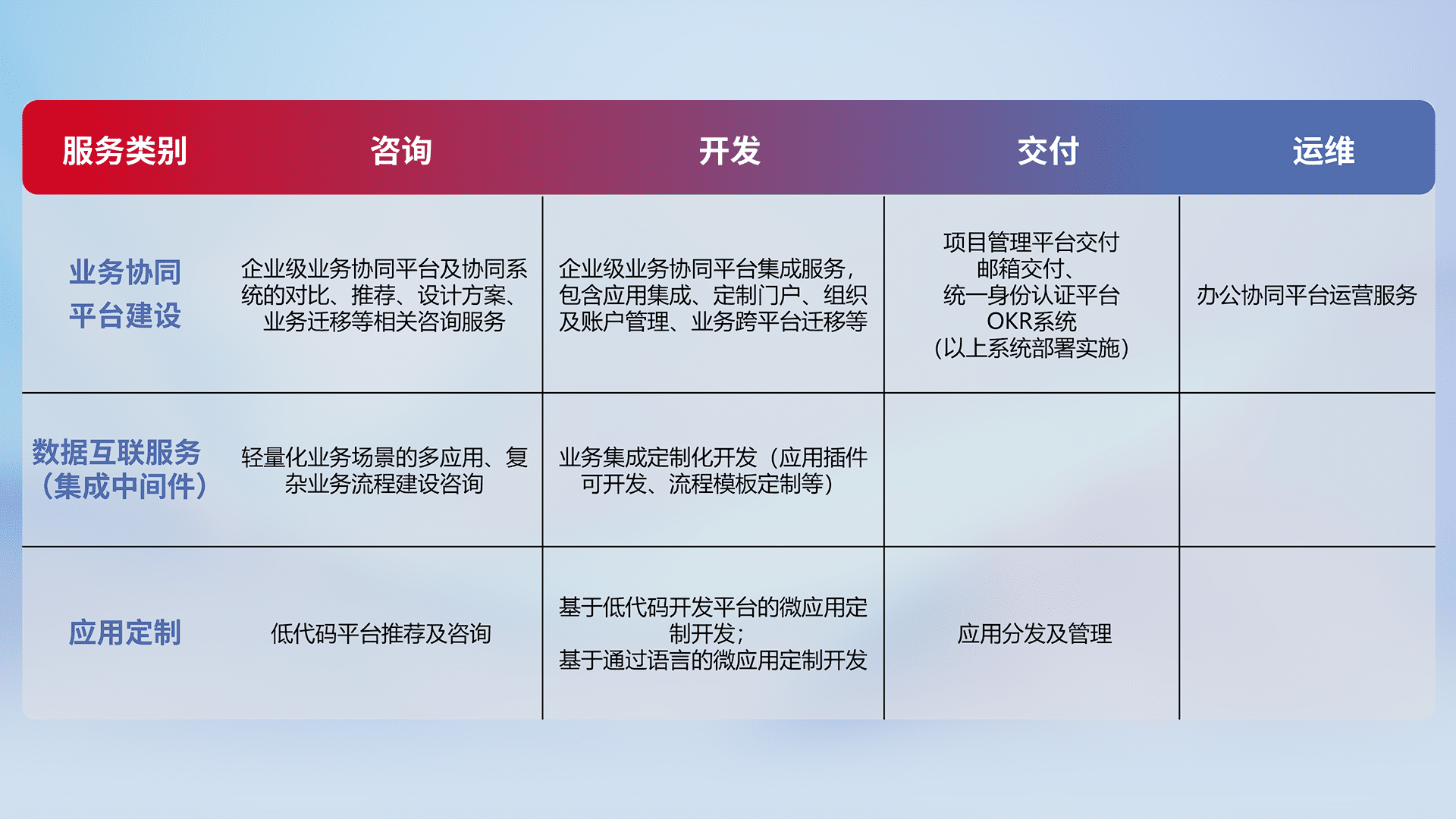 针对钉钉、、、、企微、、、IDaas等平台级产品提供产品的规划、、、方案、、、、交付、、、、定制化开发等服务,,,实现如统一协同办公、、、智能客户服务、、、、混合会议管理、、、、智能数据查询、、、、等业务场景,,,实现数字化转型。。。