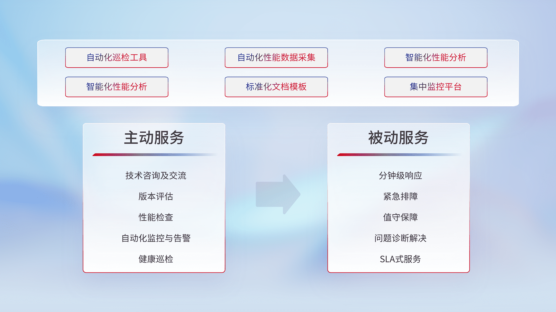 智能化工具和标准化文档,,,保障服务质量,,,,提供主动服务(包含技术咨询、、版本评估、、、、性能检查、、、自动化监控与告警、、健康巡检)和被动服务包含(分钟级响应、、、紧急排障、、值守保障、、、、问题诊断解决、、、、SLA服务)。。。。
